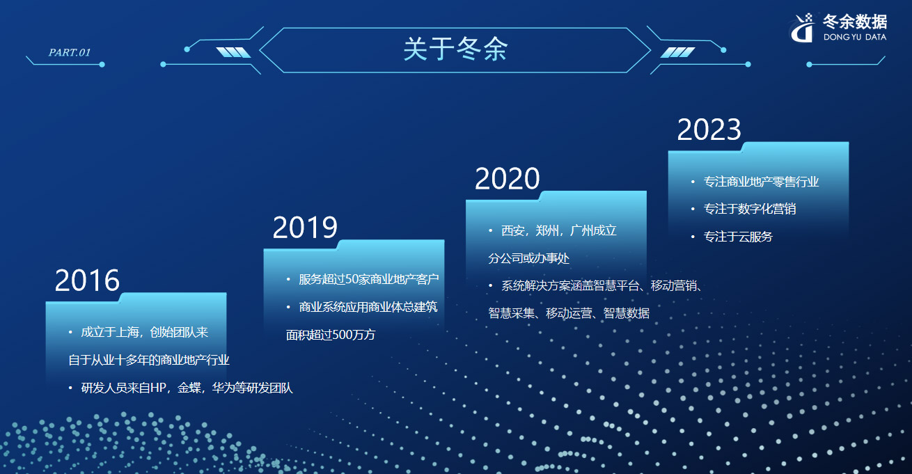 冬余致力于为商业地产提供智慧运营管理系统解决方案。总部于上海,在广州、武汉、郑州、西安设有分公司和办事处机构;公司成立以来坚信以精细化管理、智慧运营才是商业地产未来的出路,因此打造以智慧平台、移动营销、智慧采集、移动运营、智慧数据为主体的商业整体运营信息化服务商,为商业地产提供新零售时代下智慧商业信息化综合解决方案和咨询评估服务。